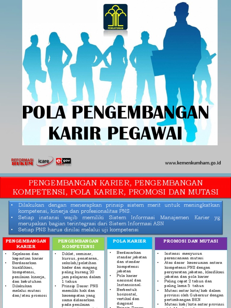 Sedangkan pengertian pengembangan karir itu sendiri adalah proses pelaksanaan (implementasi) perencanaan karir pengembangan pegawai. • setiap instansi wajib memiliki sistem informasi manajemen karier yg merupakan bagian terintegrasi dari sistem informasi asn • setiap pns harus dinilai melalui uji kompetensi pengembangan karier • kejelasan dan kepastian karier • berdasarkan kualifikasi, kompetensi, penilaian kinerja, dan kebutuhan • dilakukan melalui mutasi dan/atau promosi pengembangan kompetensi